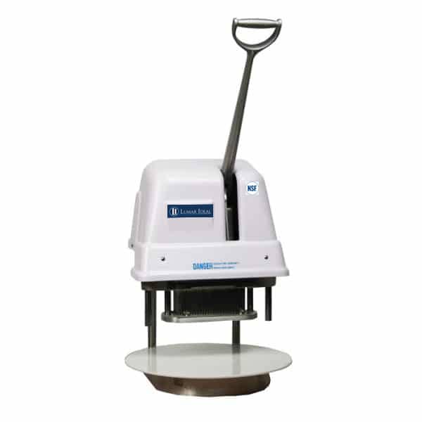 The MTM5 Commercial Meat Tenderizer designed specifically for butcher shops and small processors. The MTM5 is manually operated and features 378 stainless steel razor sharp blades that provide easy penetration. The unit comes with a 18” circular cutting board allowing the operator plenty of surface to work with smaller pieces of meat. Dual torsion springs return handle to original position. Clearance between cutting board and blade tips is 4.5 inches. The blade comb is one piece and dishwasher safe. Blade-set is easily removed for quick replacement or cleaning. The MTM5 Commercial Meat Tenderizer is designed for best food safety practices and is NSF certified.